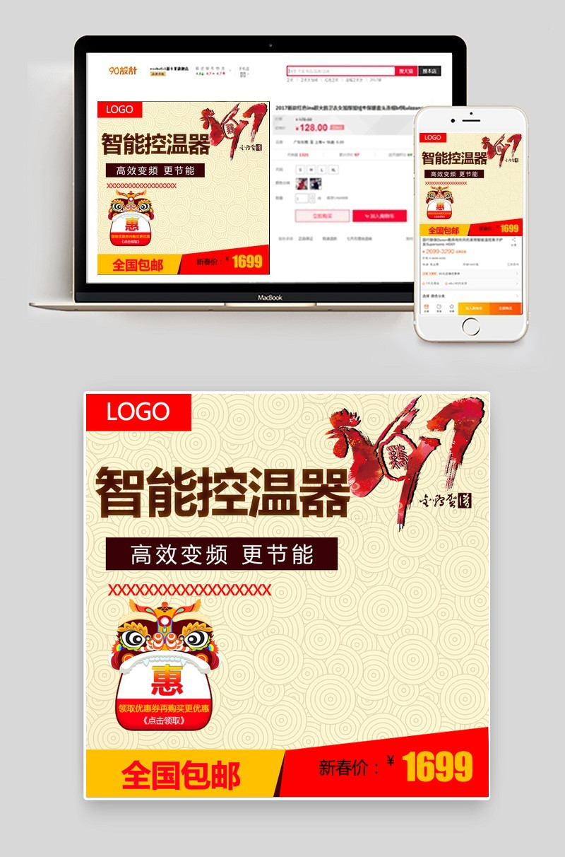 祥云背景 手绘狮子 优惠券 全国包邮 变频空调 节能空调 空调 中式风格 生活电器 主图 直通车 psd模板
