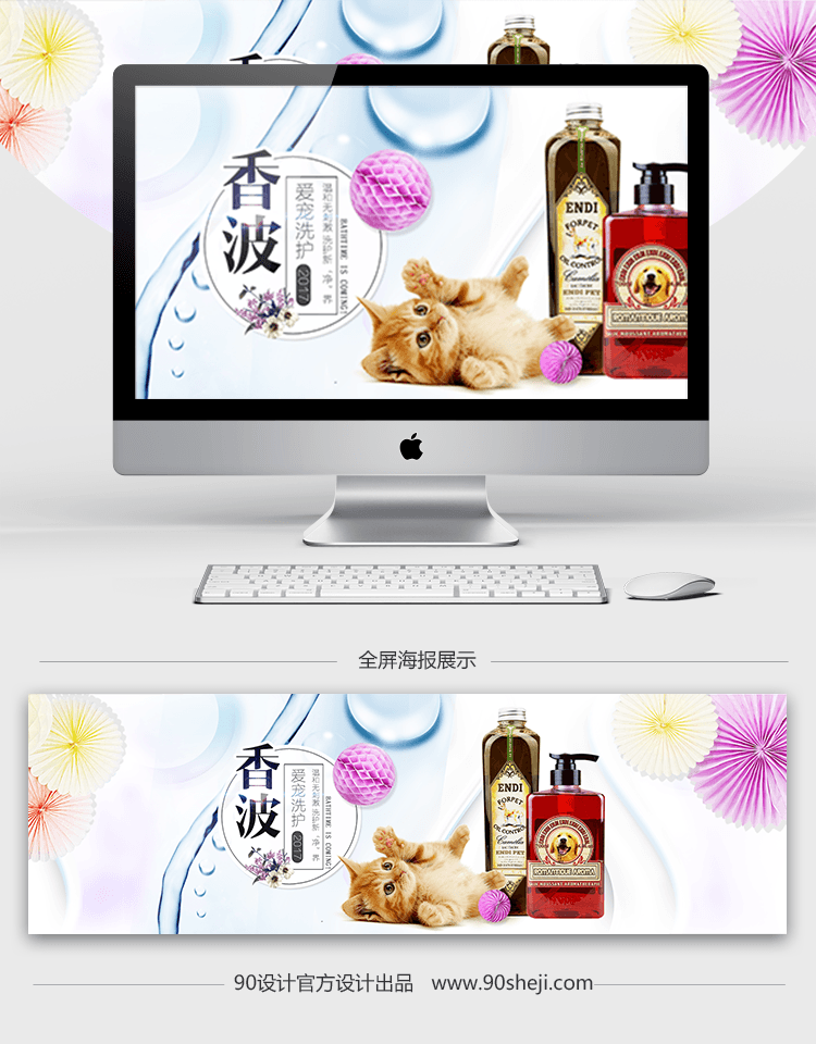 炫彩颜色背景 香波 洗澡 淘宝 天猫 梦幻 甜美 宠物 猫咪 水 折纸 绣球 花 沐浴露 香波 轮播 banner 海报 psd 圈圈 全屏海报