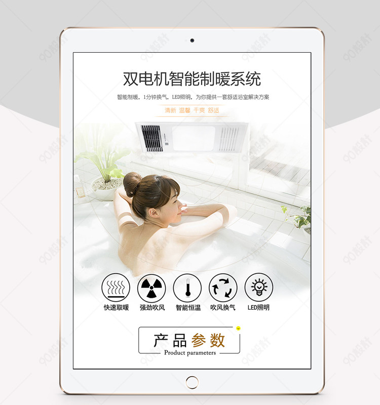 90设计提供京东简洁风格卫浴电器浴霸详情页psd模板设计素材下载,高清PSD格式。【通用】多类目可用,产品、模特均可替换。【PSD】精细分层,贴好片。【设计】由90设计师独家设计。点击右侧免费下载按钮可进行京东简洁风格卫浴电器浴霸详情页psd模板淘宝设计素材高速下载。