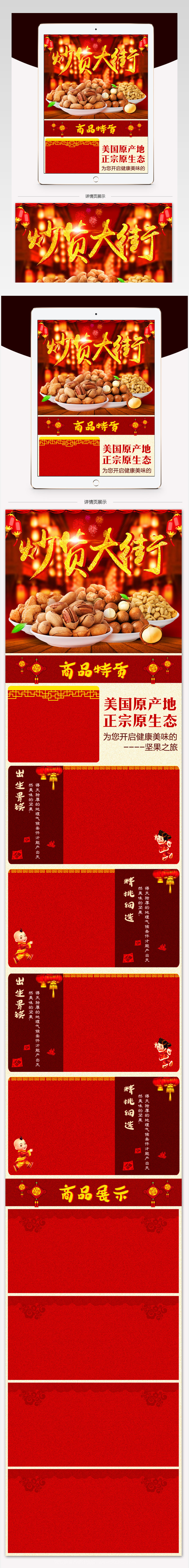 90设计提供 喜庆零食坚果详情页PSD模板设计素材下载,高清PSD格式。【通用】多类目可用,产品、模特均可替换。【PSD】精细分层,贴好片。【设计】由90设计师独家设计。点击右侧免费下载按钮可进行 喜庆零食坚果详情页PSD模板淘宝设计素材高速下载。