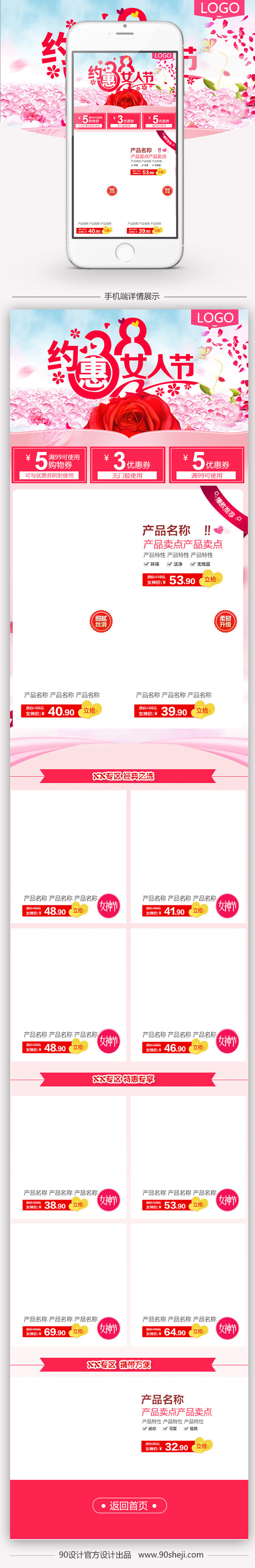 90设计提供粉色甜美风38约惠手机端首页PSD模版设计素材下载,高清PSD格式。【通用】多类目可用,产品、模特均可替换。【PSD】精细分层,贴好片。【设计】由90设计师独家设计。点击右侧免费下载按钮可进行粉色甜美风38约惠手机端首页PSD模版淘宝设计素材高速下载。