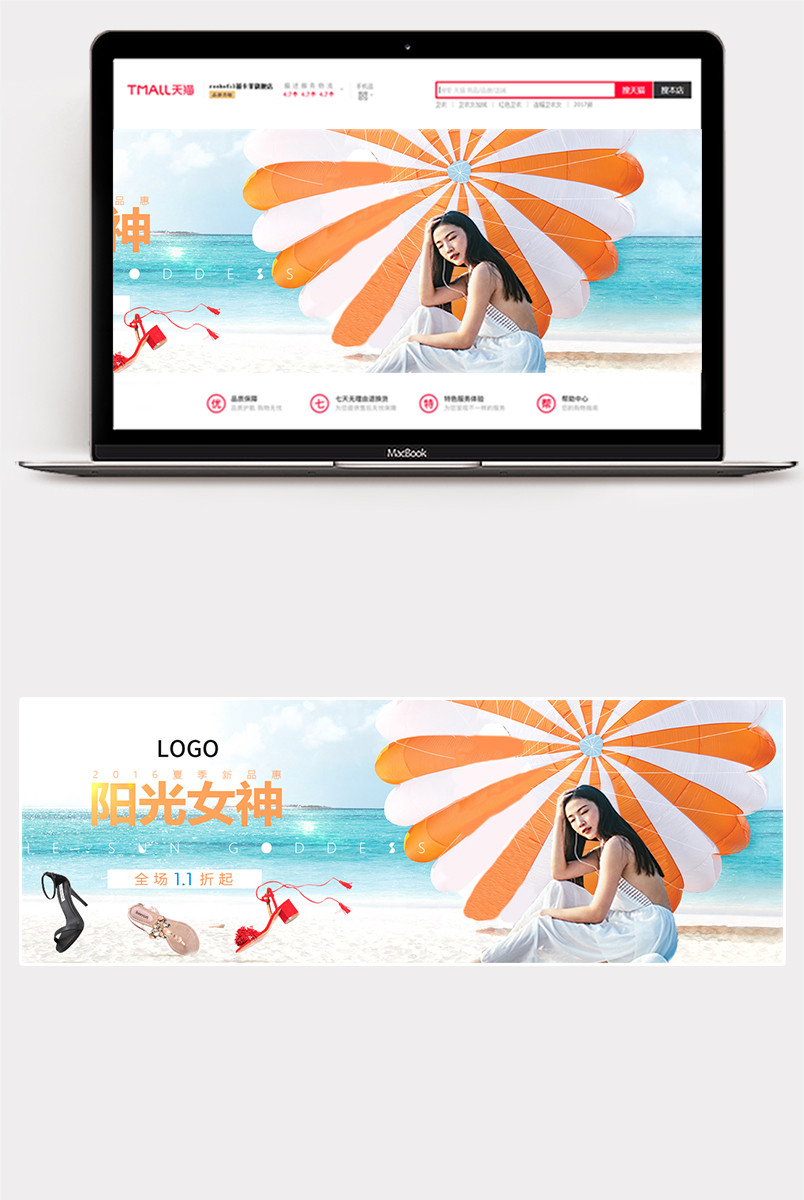 沙滩海边背景 蓝色 遮阳伞 凉鞋 拖鞋 高跟鞋 清新 唯美 简约 psd模板 首页全屏海报 女鞋 时尚