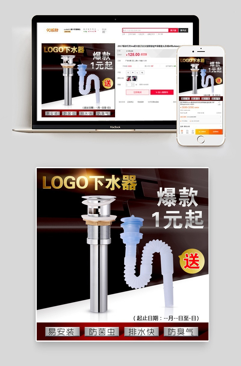 淘宝 天猫 下水主图 下水器主图 洗面盆下水器主图 下水器直通车图 科技感主图 质感主图模板 五金产品主图 下水器 爱图