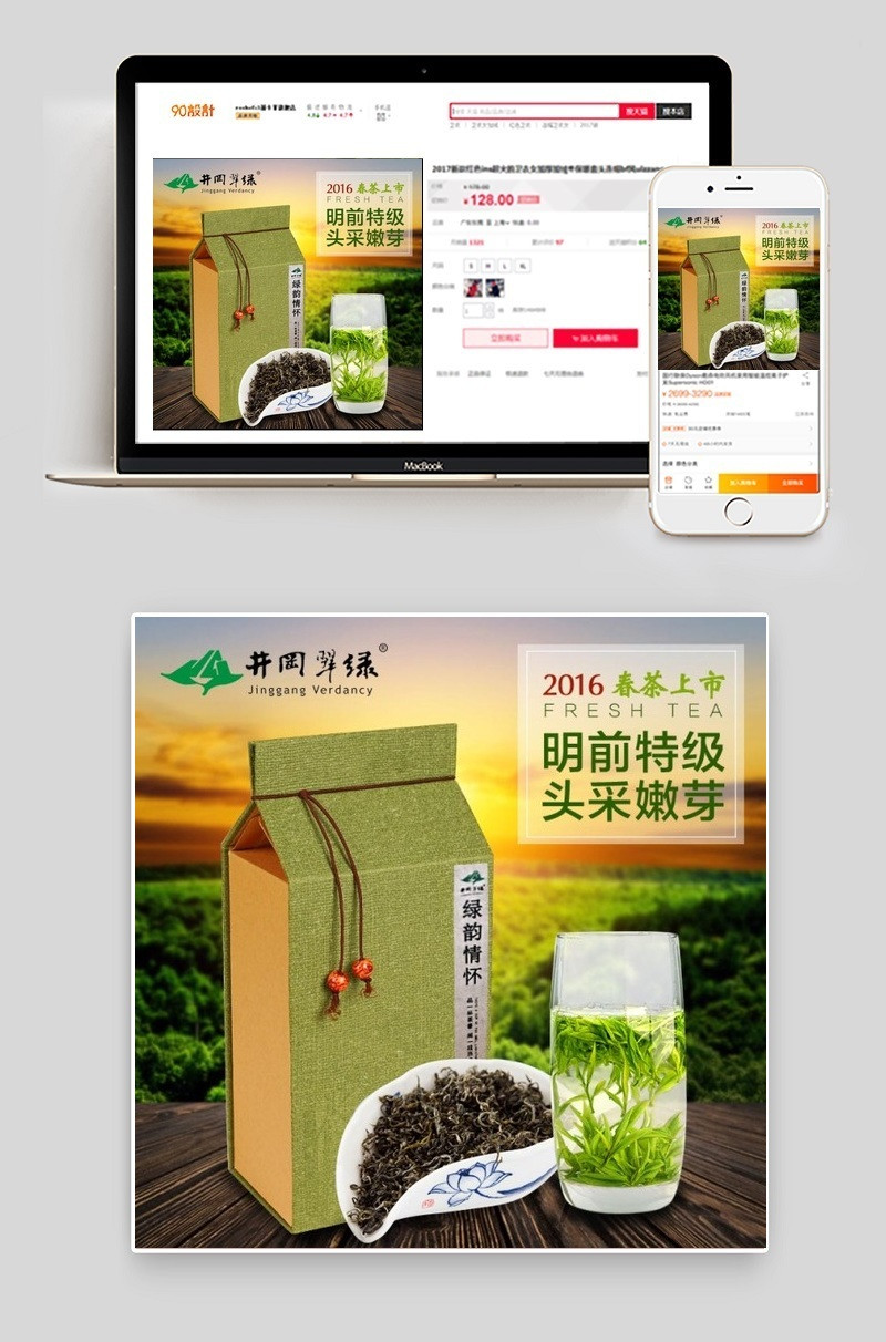90设计提供井冈翠绿茶叶主图设计素材下载,高清PSD格式。【通用】多类目可用,产品、模特均可替换。【PSD】精细分层,贴好片。【设计】由90设计师独家设计。点击右侧免费下载按钮可进行井冈翠绿茶叶主图淘宝设计素材高速下载。