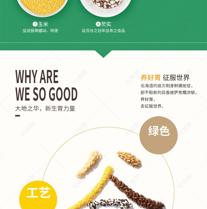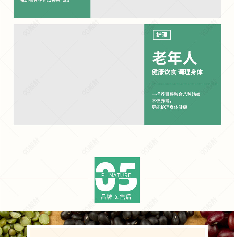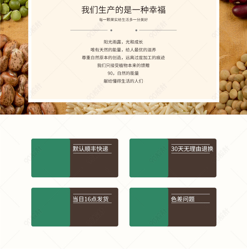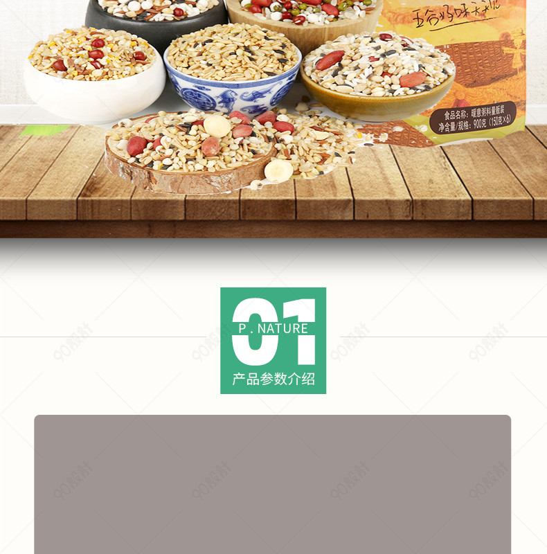 90设计提供简约小清新五谷杂粮大米粮食详情页设计素材下载,高清PSD格式。【通用】多类目可用,产品、模特均可替换。【PSD】精细分层,贴好片。【设计】由90设计师独家设计。点击右侧免费下载按钮可进行简约小清新五谷杂粮大米粮食详情页淘宝设计素材高速下载。