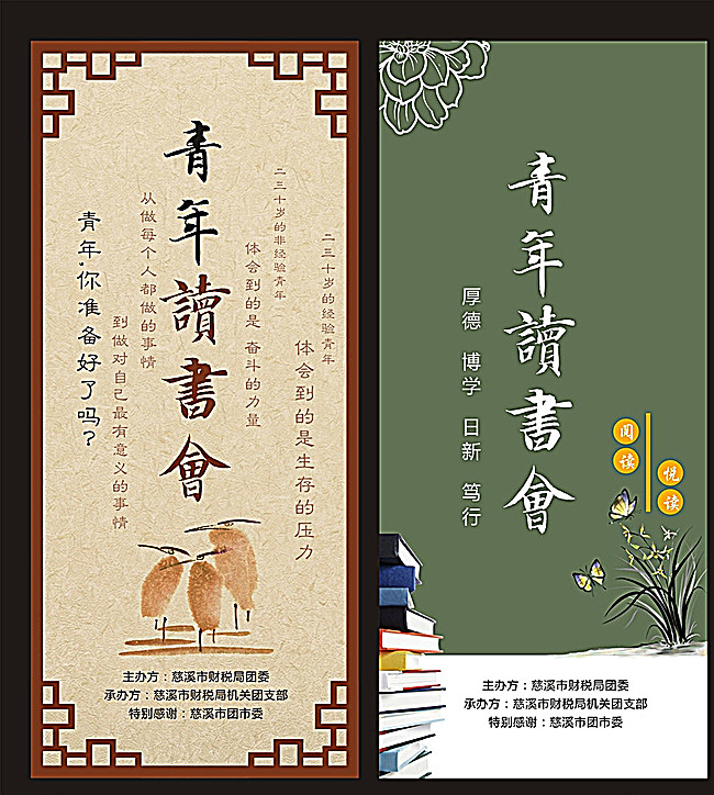 青年读书会 展架模板 红木框 古风 矢量 可编辑 蝴蝶 花朵剪影 书本 小草插画 墨绿色 设计 广告设计 海报设计 CDR