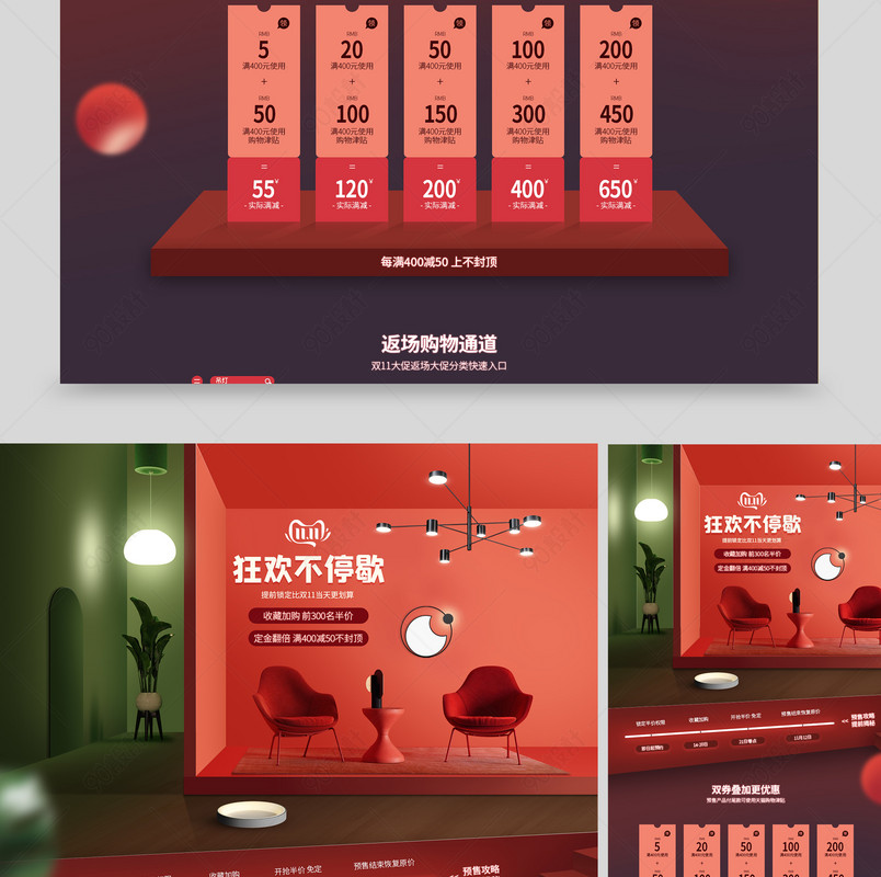90设计提供双11返场灯饰家具建材类活动首页设计素材下载,高清PSD格式。【通用】多类目可用,产品、模特均可替换。【PSD】精细分层,贴好片。【设计】由90设计师独家设计。点击右侧免费下载按钮可进行双11返场灯饰家具建材类活动首页淘宝设计素材高速下载。