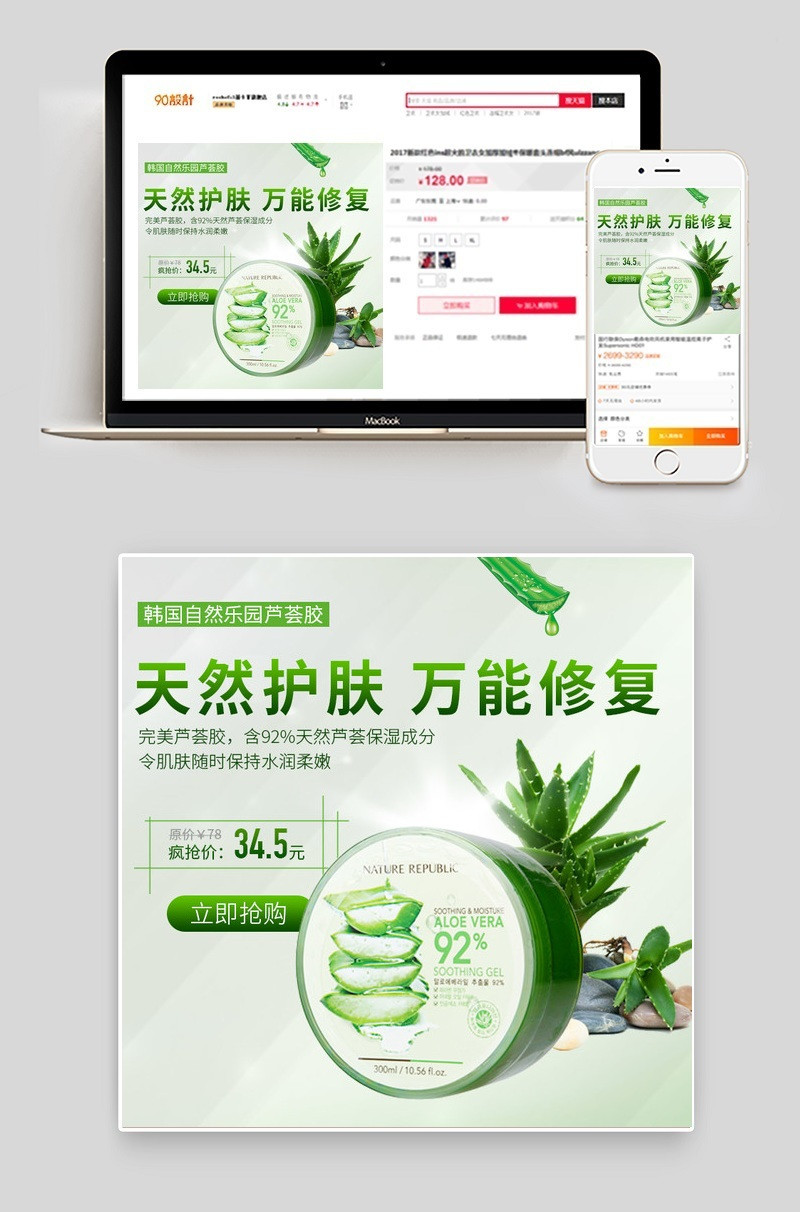 韩国 自然乐园 芦荟胶 完美祛痘 祛印 保湿 面膜 美容护肤 美体 精油 乳液 面霜 淘宝主图 直通车图 设计 模板 绿色 芦荟 祛痘