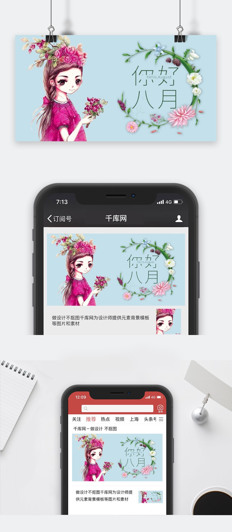 90设计提供原创八月你好公众号封面图设计素材下载,高清PSD格式。【通用】多类目可用,产品、模特均可替换。【PSD】精细分层,贴好片。【设计】由90设计师独家设计。点击右侧免费下载按钮可进行原创八月你好公众号封面图淘宝设计素材高速下载。