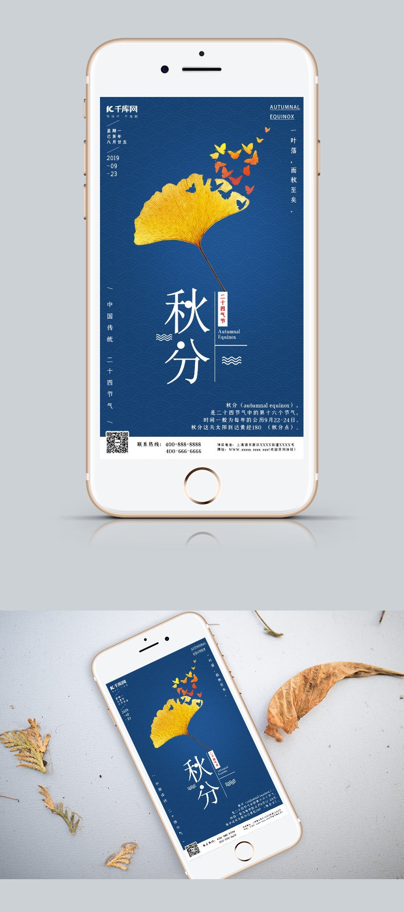 原创 中国风 蓝色 大气 简约 秋分 秋分节气 传统节气 秋天 银杏叶