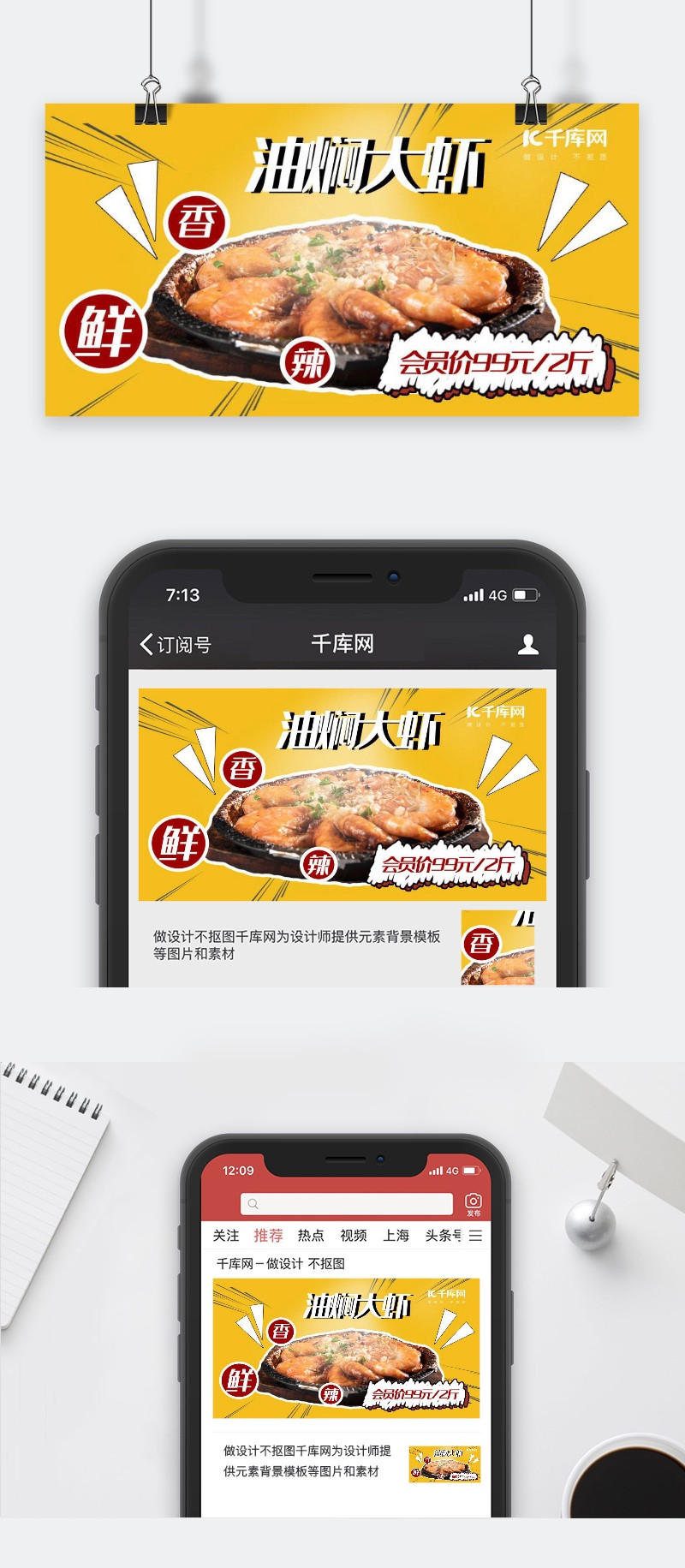 漫画风黄色系海鲜大虾手机配图微信公众号封面