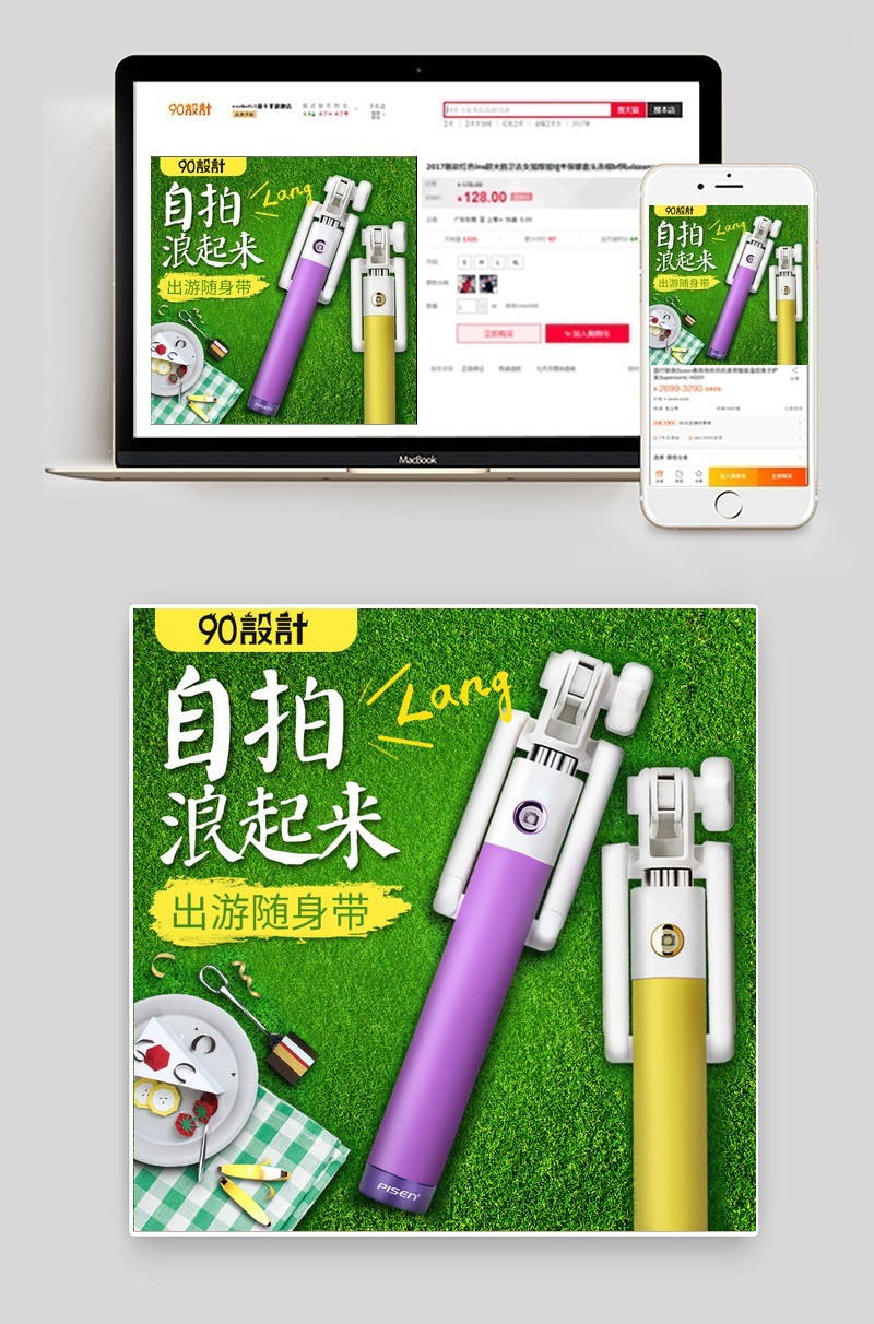绿色踏春草地自拍杆时尚小清新主图